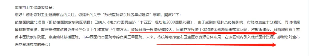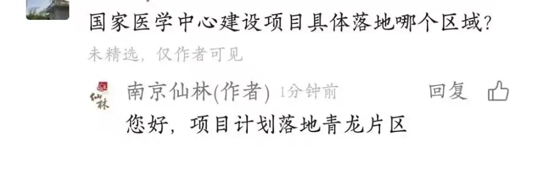2025年5月,南京医科大学第一附属医院党委关于巡视整改进展情况的通报”中提到关于“国家医学中心创建滞后”问题的整改情况,再次披露了项目进展:《国家医学中心建设方案》已于2025年由省政府正式上报至国家卫健委和国家发改委;《栖霞院区一期工程项目建议书》已于2025年报送了立项请示。2024年,有网友曝光了仙林管委会的回复:计划落地青龙片区。