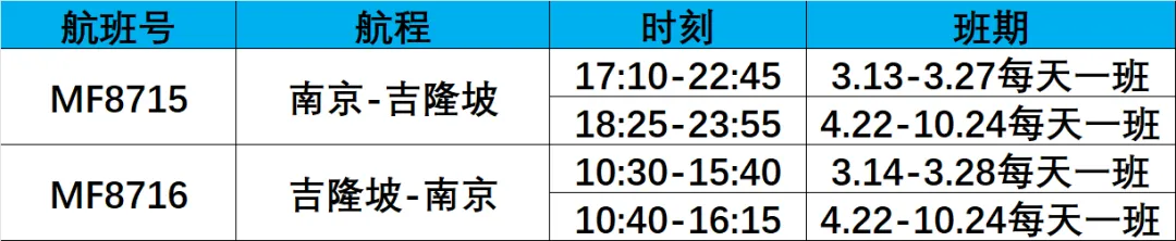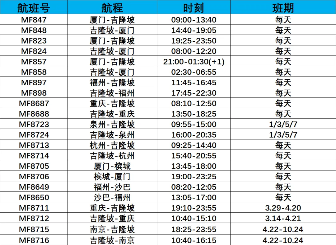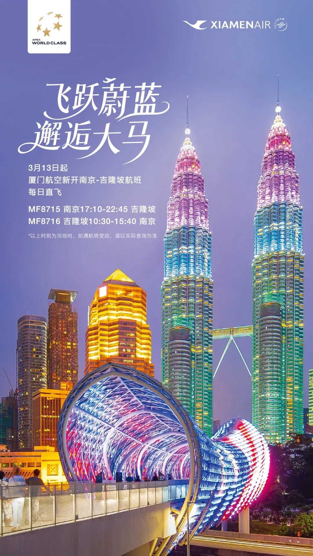 2026年3月13日起,厦门航空新增一班南京-吉隆坡直飞航班,详情如下: