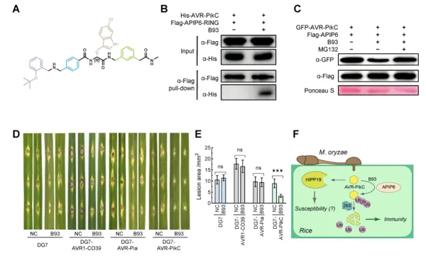 该研究基于水稻——稻瘟菌的互作系统。APIP6是一种水稻胞内的E3泛素连接酶,正调控水稻对稻瘟菌的免疫。AVR-PikC是一种在稻瘟菌生理小种中广泛存在的效应蛋白、可进入水稻细胞,但目前尚未发现可识别该蛋白的免疫受体。该研究通过DNA编码的化合物库,筛选到小分子B93。体外的表面等离子共振和pull-down实验表明,B93可同时与APIP6-RING(APIP6的RING结构域)和AVR-PikC互作,并可介导两种蛋白形成复合物;体内的co-IP和水稻接种实验表明,B93可介导AVR-PikC被蛋白酶体降解,且能抑制含有AVR-PikC基因的稻瘟菌对含有APIP6基因的水稻的致病力。