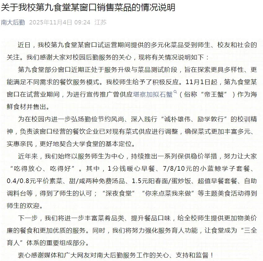 11月4日,南京大学后勤服务集团发布“关于我校第九食堂某窗口销售菜品的情况说明”,表示已不再售卖999元帝王蟹。