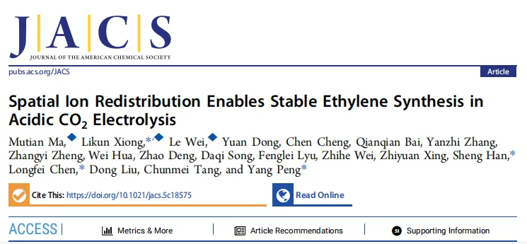 上海应用技术大学熊力堃、韩生、苏州大学彭扬、南京理工大学陈龙飞在国际知名期刊《Journal of the American Chemical Society》发表题为“Spatial Ion Redistribution Enables Stable Ethylene Synthesis in Acidic CO2Electrolysis”的研究论文,熊力堃、Mutian Ma、Le Wei为论文第一作者,熊力堃、韩生、彭扬、陈龙飞为论文共同通讯作者。