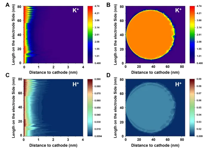 图1. 模拟Cu和PCN修饰Cu电极的界面离子分布。