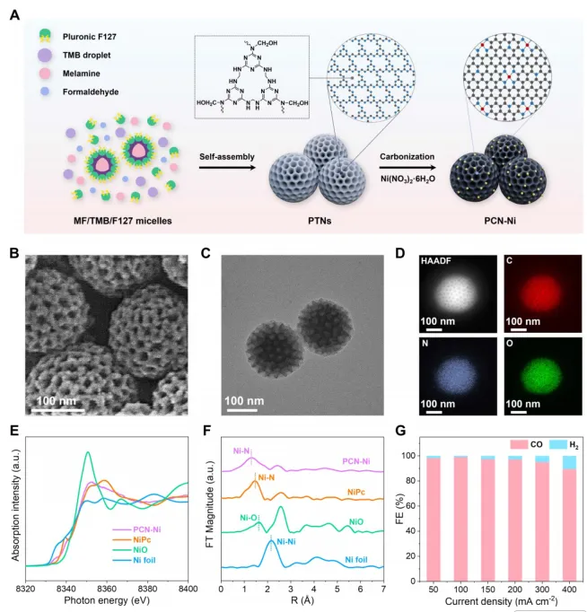 2.协同功能层架构:设计 Cu/PCN-Ni/PTNs 分层电极,多孔碳纳米笼(PCNs)实现 K+的电容性存储与空间再分布,聚合物三嗪纳米笼(PTNs)通过质子化三嗪基团的唐南排斥效应调控质子传输,单原子 Ni 位点提供原位 CO 生成,形成多功能协同体系。