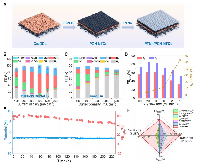 PTNs/PCN-Ni/Cu 电极在工业级电流密度下实现了卓越的乙烯选择性与长期稳定性,其单通道碳效率远超碱性体系,验证了离子门控策略的有效性。该工作提出的 “离子管理与催化功能解耦” 设计范式,不仅突破了酸性 eCO2R 的选择性 - 稳定性权衡,更为先进电催化体系的设计提供了通用框架,推动碳中性化学制造技术的工业化进程。