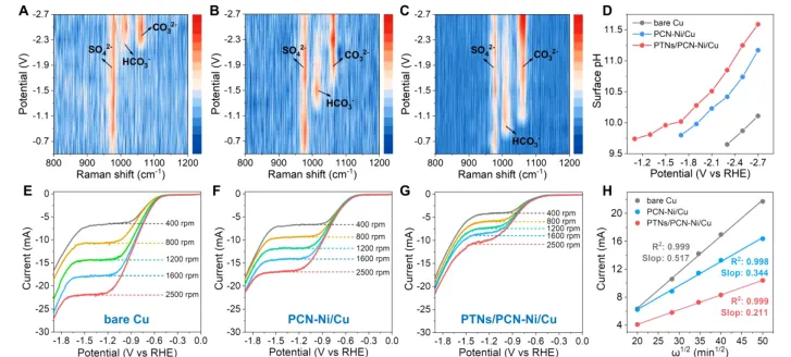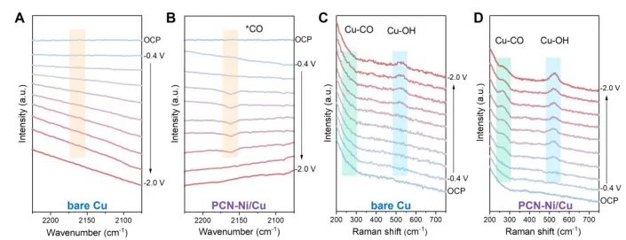图4. eCO2R过程中*CO在bare Cu和PCN-Ni/Cu上的原位表征。