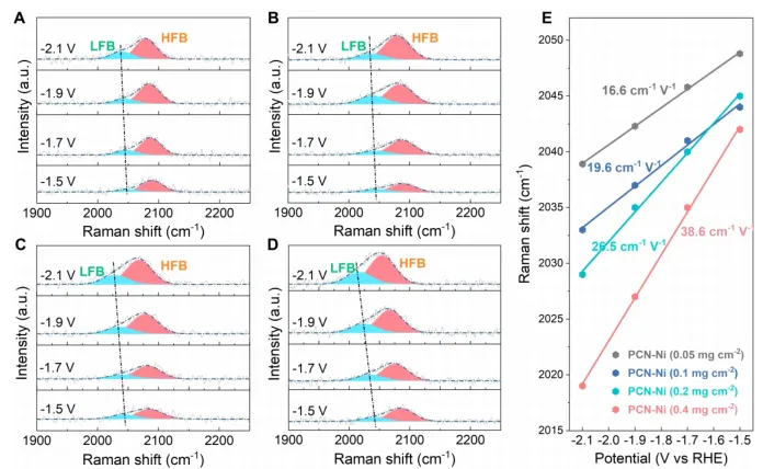 图5. 不同PCN-Ni负载下*CO在PCN-Ni/Cu上的电位依赖拉曼位移。