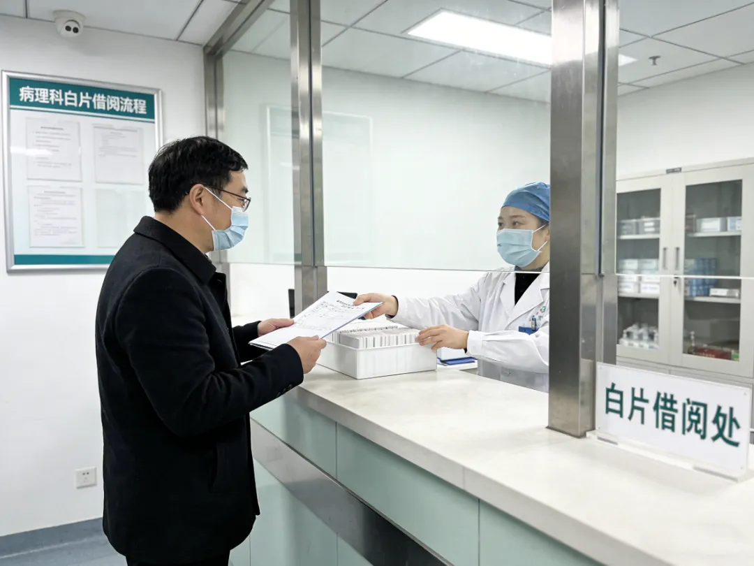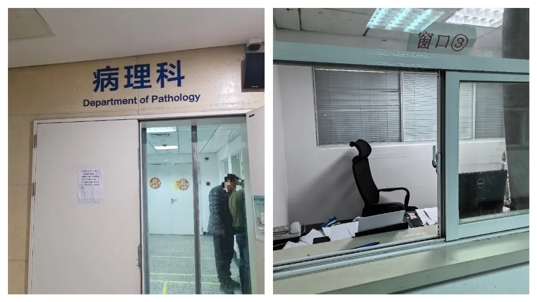 前往「1号楼2楼病理科」,进门后左手边有一个小窗口,把刚才拿到的病理科方便号交给医生。