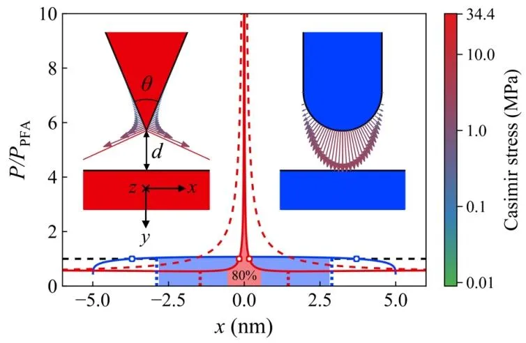 以开口角 45° 的理想导体楔板系统(板间距 5nm)为研究对象,团队发现楔板斜面的 Casimir 应力在顶点附近急剧增强,在距顶点 0.01nm 处的应力约为半圆柱 - 板系统最低点应力的 20 倍,而半圆柱表面的 Casimir 应力则呈平滑变化,证实几何奇点是 Casimir 应力集中的关键诱因。进一步量化分析显示,楔板顶点附近的 Casimir 应力远超 PFA 预测值,在 x<0.167nm 区域应力超过 PFA 压力近 10 倍,且 80% 的净力由 4.8% 的中心区域贡献,而 PFA 需要 12.7% 的中心区域才能产生同等比例的净力,直接证明 PFA 在描述几何奇点附近 Casimir 应力时完全失效。