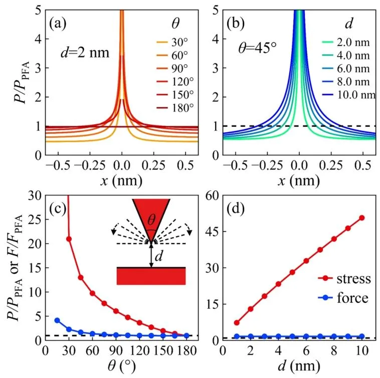 团队系统探究了楔板开口角和板间距对 Casimir 应力集中的影响:在板间距 2nm 时,顶点附近的应力与 PFA 压力的比值随开口角增大从 30° 时的 21.0 降至 150° 时的 1.97,应力集中区域随开口角增大而扩展,钝楔的应力分布更均匀;对于 45° 开口角的楔板,顶点附近应力比随板间距增大而显著提升,板间距从 1nm 增至 10nm 时,应力比从 7.31 升至 50.6,且集中区域同步扩展。此外,该效应还与材料介电函数相关,金、硅等实际材料的应力集中程度弱于理想导体,且应力存在非零切向分量,顶点附近应力较理想导体低一个数量级。