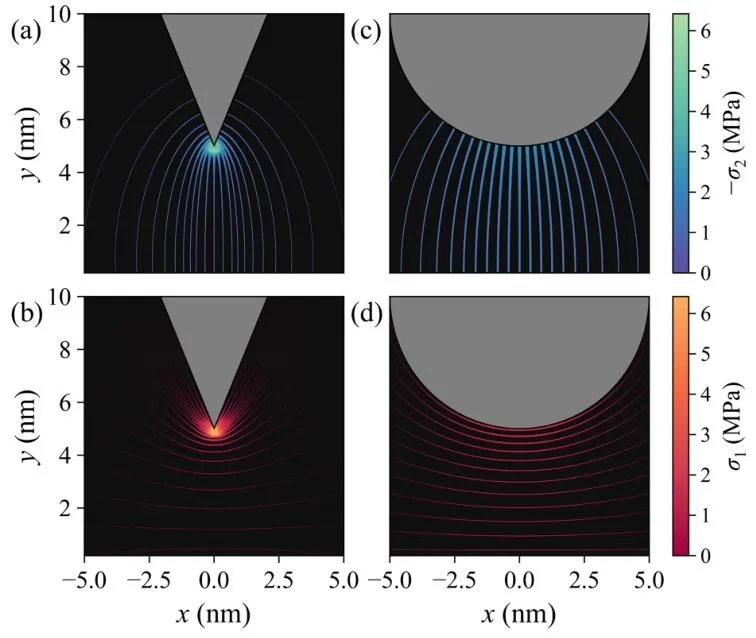 为揭示应力集中的物理机制,团队开展了麦克斯韦主应力轨迹分析,发现板端发射的平行压缩主应力轨迹为满足楔板斜面的边界条件发生偏转,在顶点附近聚集,而半圆柱 - 板系统的应力轨迹分布均匀,证实几何奇点与边界条件的共同约束是 Casimir 应力集中的核心原因。该效应与经典力学中尖锐压头压痕实验的弹性应力集中相似,也可类比为尖锐尖端的静电电荷积累,是量子尺度下的经典力学效应类比。