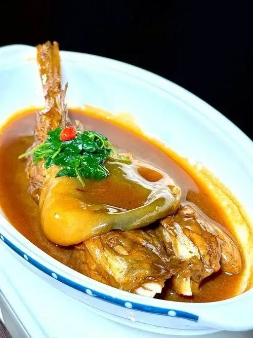 🥢 扬中红烧河豚(简述):这菜讲究“火候”二字。河豚处理干净后,肝是精华,得先熬出油。下鱼,加酱油、糖、啤酒慢炖。最妙的是那张皮,炖到最后,反卷过来,上面的小刺全化了,入口不是扎嘴,而是糯叽叽的胶质感,抿一口,嘴唇都要粘住。