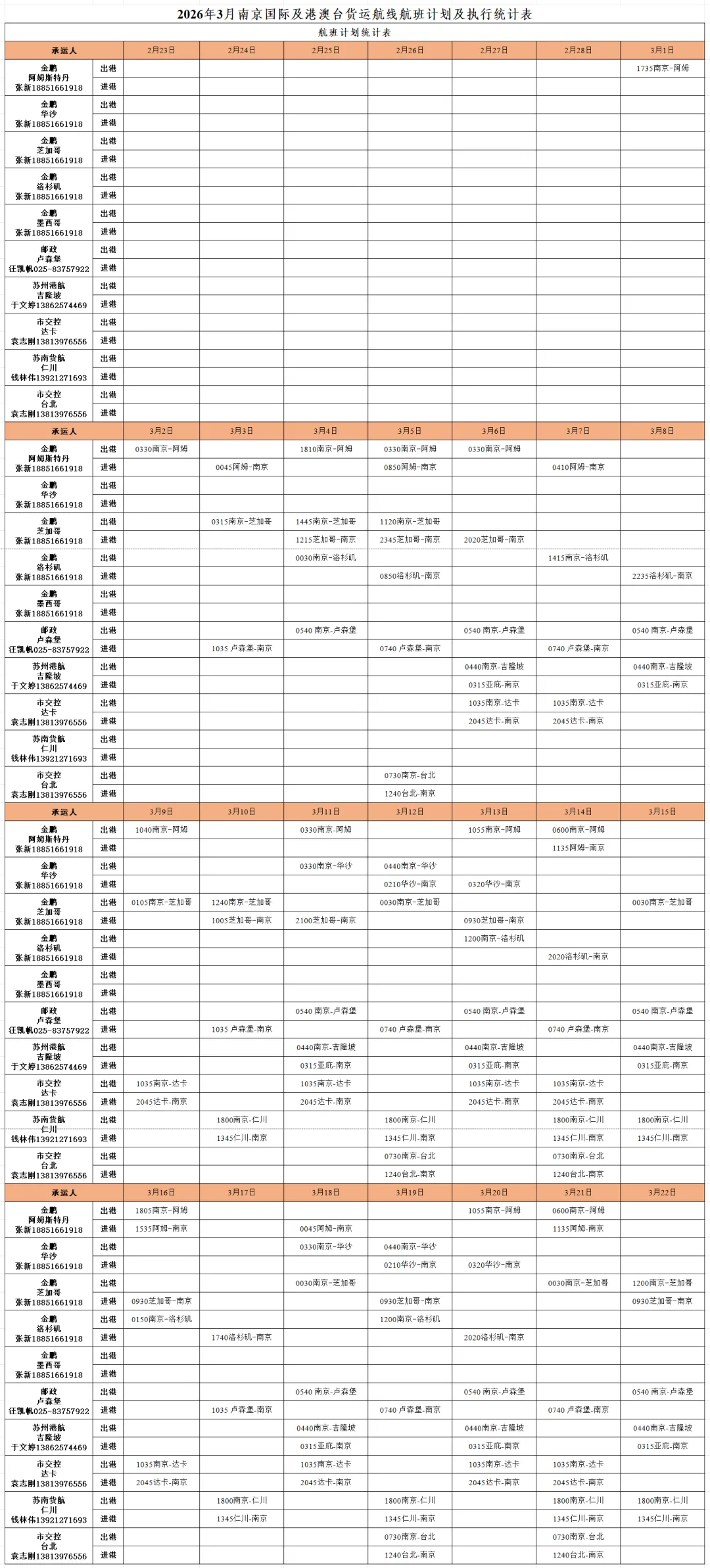 南京=国际及港澳台航空货运航线计划表来啦!(2026年3月)
