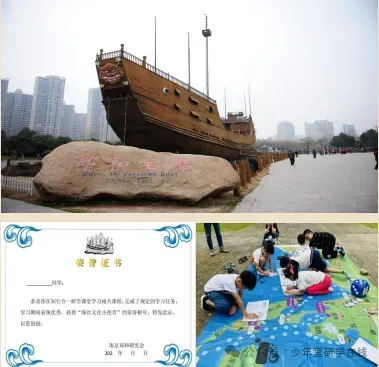 4、完成研学手册内容:“给郑和的一封信”。 体验式活动:分组参加”航海图大作战“比拼,整合所学知识,理解航海奥秘,获得荣誉证书。