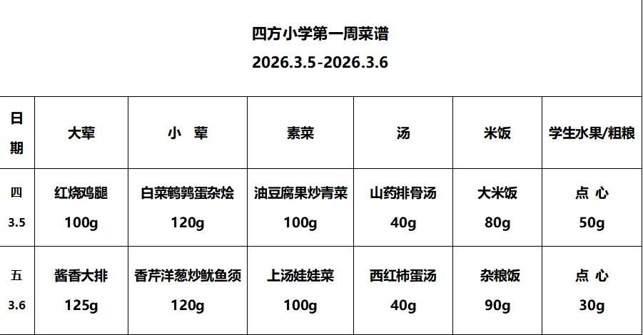 >南京市四方小学2025-2026年度第二学期第1周菜谱