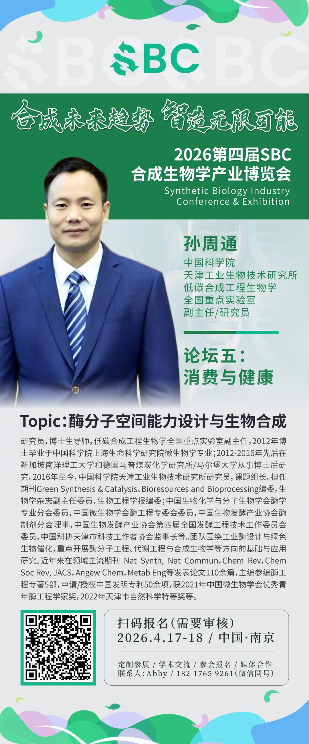 2026第四届合成生物学产业博览会(SBC2026)将于4月17-18日在南京扬子江国际会议中心召开!本届博览以“合成生物未来趋势,智造无限可能”为主题,围绕医美日化、农业与天然产物、生物制造与新材料、食品与营养、消费与健康等内容展开深度探讨。会议将汇聚全球顶尖的专家学者、企业家与投资人,在交流与碰撞中共同推动合成生物学从实验室走向生产线、从技术成果走向市场商品,为中国合成生物学产业的发展注入新的活力与动能。