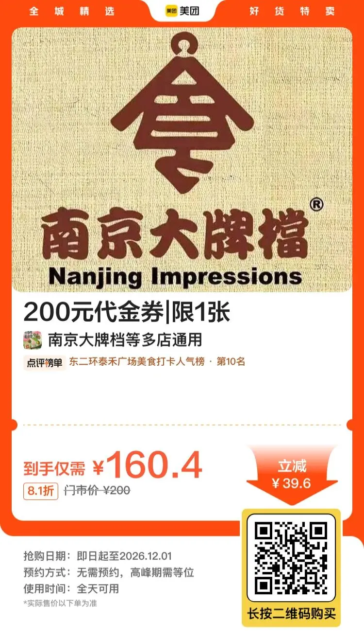 🔥【南京大牌档|200元代金券|限1张|多店可用】