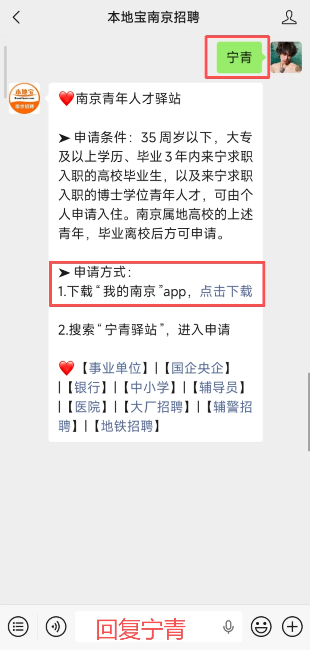 ⭐推荐服务:您可以扫描下方二维码,关注【本地宝南京招聘】公众号,回复【宁青】,即可获取“我的南京”app下载链接!