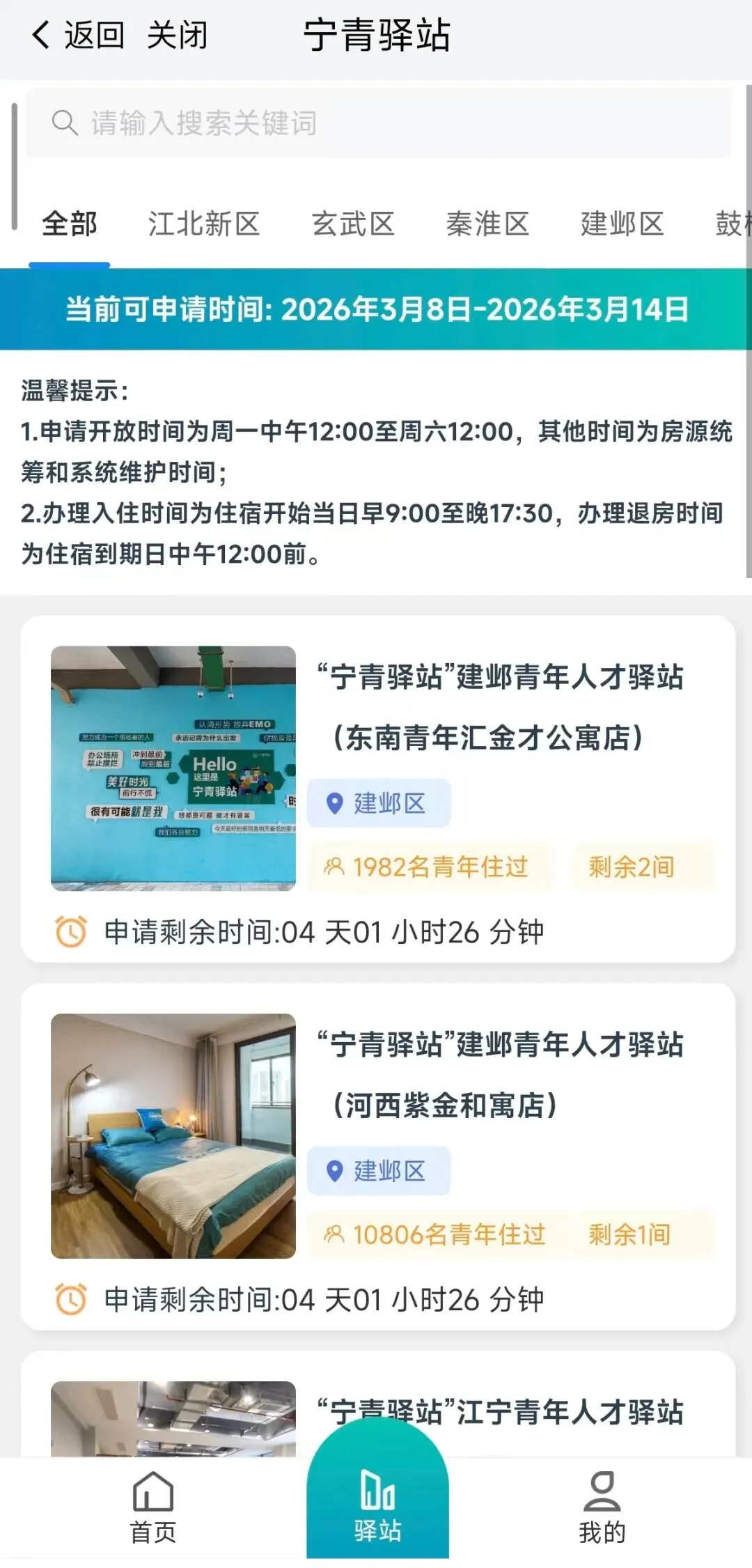 1.进入我的南京-宁青驿站专栏,点击驿站,即可查看可以申请的驿站;