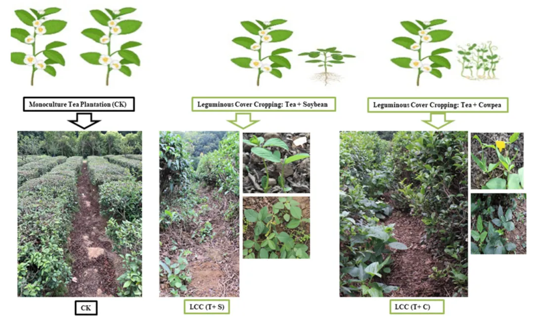 研究在南京市中山陵茶厂试验站进行,选用‘南京雨花’茶品种。实验共设置三个处理:单作(MCC)、间作大豆(LCC-S)和间作豇豆(LCC-C) 。在茶行间隙播种大豆(品种:Lamar)和豇豆(品种:苏夏 1 号),并遵循随机区组设计(RCBD)进行重复。实验期间不施用任何化肥、农药或除草剂。