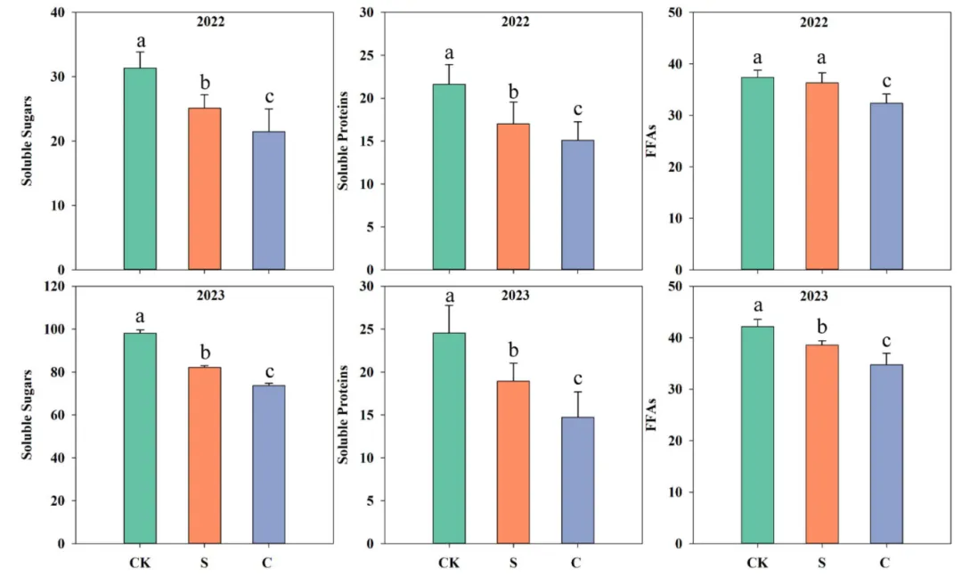 图 2. 单作模式 (MCC, 作为对照 CK) 以及间作大豆 (S) 和豇豆 (C) 的豆科覆盖耕作 (LCC) 下,茶树叶片可溶性营养成分的浓度 (mg/g)(FFAs 指游离脂肪酸)。对于同一测量指标,柱形图上不同的对应小写字母表示根据 Tukey's HSD 检验在 P < 0.05 水平下各处理间差异显著。
