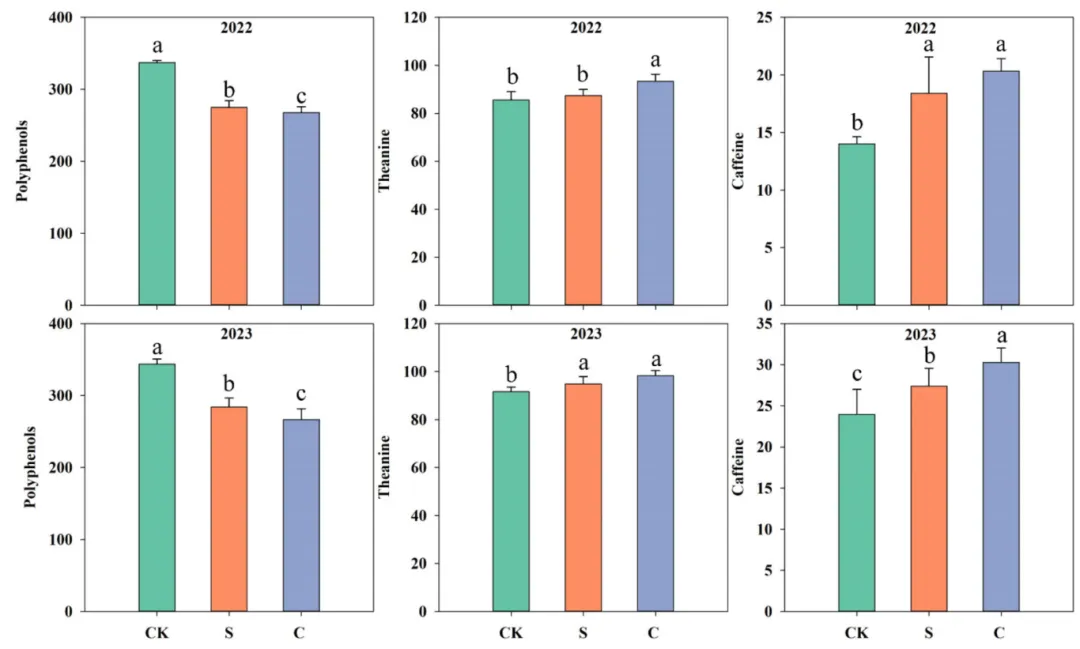生物活性化合物:间作显著提升了茶叶的品质核心指标。LCC-S 和 LCC-C 均显著提高了咖啡碱的含量 。对于茶氨酸,间作豇豆在 2022 年显著提升了其浓度,而 2023 年两种间作模式均表现出显著的增益效果。