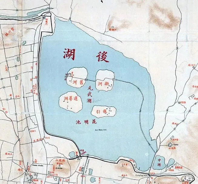 1898年绘制的这版《江宁府城图》原版为彩色石印本,由当时来自法国的传教士方殿华神父绘制,用中文、法文注记。该图运用经纬网控制测绘,测绘技术与精度控制已达到较高水平。地图要素完备,表达简明、清晰,详略得当。城池形状与现代南京城市测绘地图基本相同,反映了19世纪90年代后期的南京城市景观。图中用大号字体标注后湖,同时标注为元武湖、昆明池,湖中标有新洲、旧洲、莲萼洲、龙引洲四洲。与后湖相对应,该地图上还标注了前湖(钟山前面又名燕雀湖)、中湖(太平门外)。