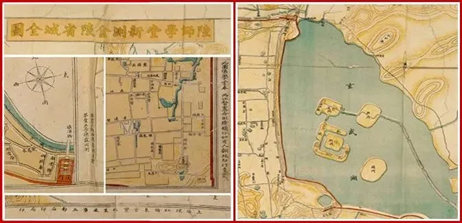 ▲陆师学堂《新测金陵省城全图》局部备注(左)及玄武湖(右)