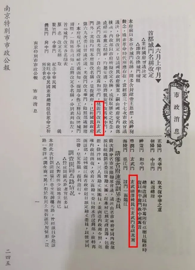 1928年7月31日,在《南京特别市市政公报》第16期(见图5)市政消息版中提到:“桃源门改为玄武门……玄武湖泽被民生,玄武门名副其实。”玄武门由此定名。
