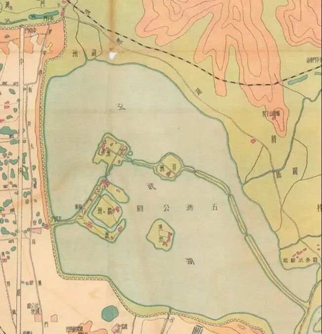 在1935年5月版的《南京城市图》中,“玄武湖公园”标注为“五洲公园”,湖中五洲清晰可见。