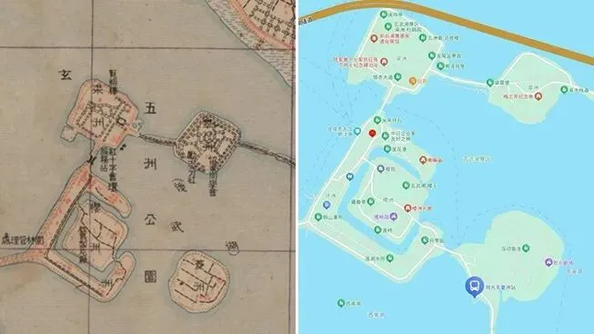 ▲《南京市街道详图》(1947)中的玄武湖(左)VS 当代电子地图上的玄武湖(右)