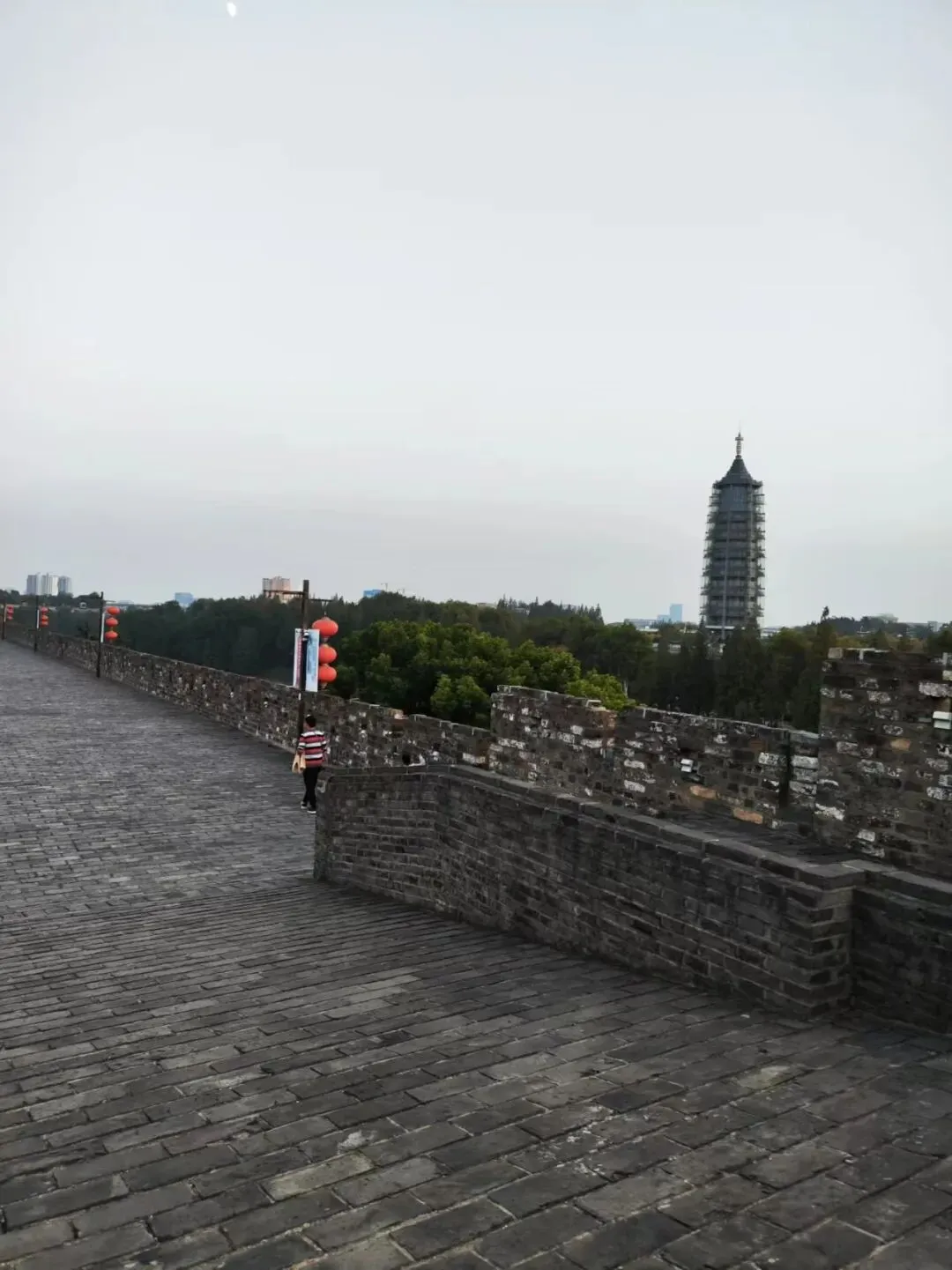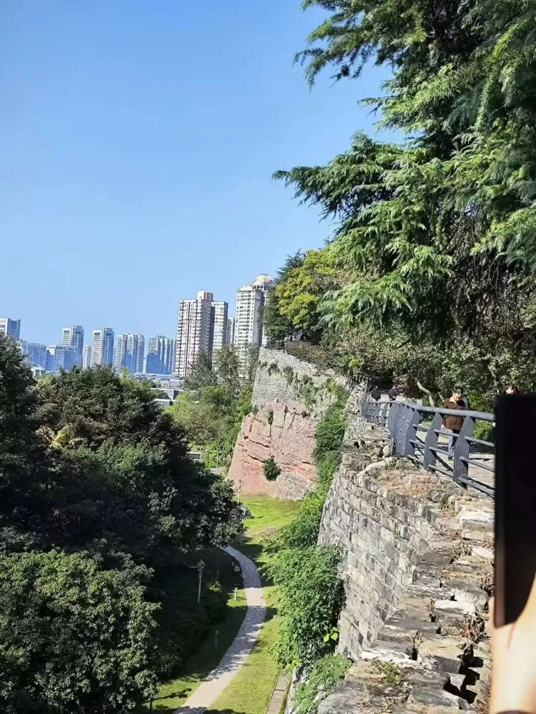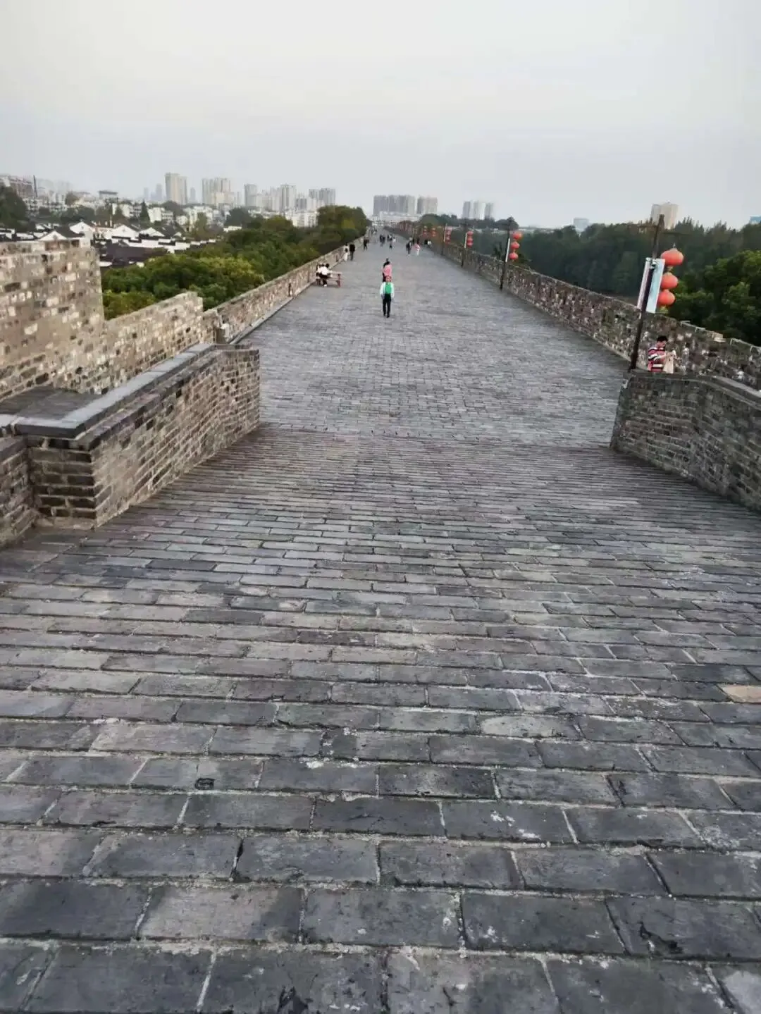沿着古长城应该可以走到石头城的,但是毕竟人到中年,坐车来到石头城公园,我们是从一个小区走到秦淮河边的,所以跟着锻炼的人向鬼脸处走去,开始在城外沿着河水,过了一个门就到了城里,自然就可以上城墙了,城墙也就10米左右,顶部不宽,走在朱元璋修建的城墙上,怎么也体会不到防守城市的感觉,因为右手边都是更高的民居建筑。
