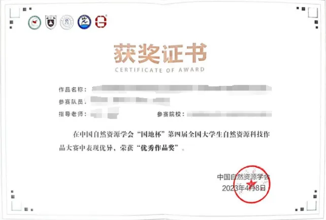 中国自然资源学会“国地杯”第四届全国大学生自然资源科技作品大赛中,荣获“优秀作品奖”
