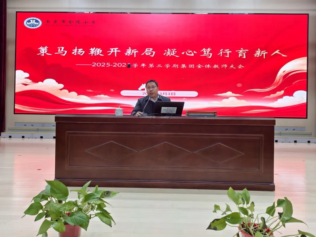 春启新程,慧润杏坛。为全面落实立德树人根本任务,锚定新学期发展目标,凝聚全体教师奋进力量,3月3日,南京市金陵小学召开2025-2026学年第二学期集团全体教师大会。本次大会以“策马扬鞭开新局 凝心笃行育新人”为主题,由王新副校长主持。全体教师齐聚一堂,以昂扬之姿、奋进之心,开启新学期育人新征程。