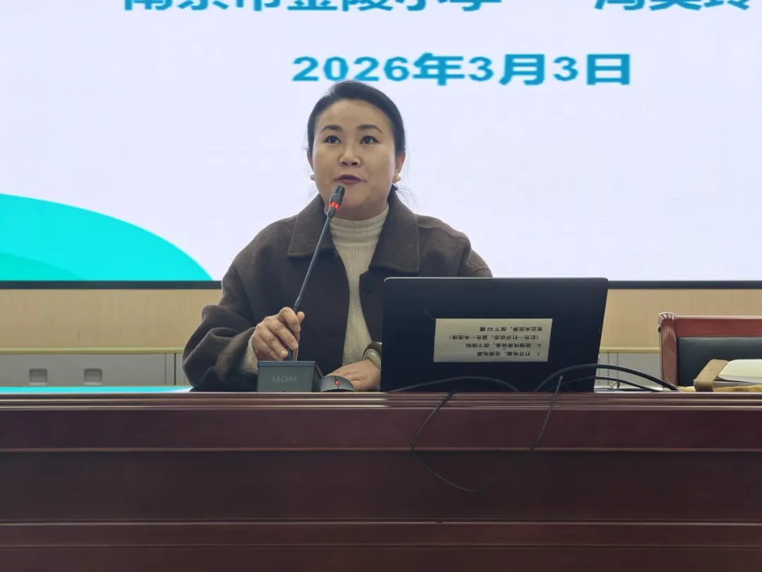 南京市金陵小学党委书记李玮作总结。她紧扣教育部 2026 年新春第一会“健康第一”的核心精神与省市相关部署要求,结合学校创建南京市基础教育排头兵的发展目标,从“健康第一”的重要意义、省市新学期具体工作要求、学校发展的核心抓手及新学期落实工作的底线和标准等方面展开阐述。在落实省市新学期工作要求上,李书记强调面向家庭,筑牢健康共育防线;面向教师,夯实健康育人能力;面向学生,打造健康成长生态,同时明确要求全体教师转变教育理念,将学生身心健康摆在首位,切实落实“2・15”行动等八项重点任务,践行干群、师生、家校、亲子、伙伴五大关系的新要求,强调要以数字化赋能教育教学,深化评价改革,坚守教育初心,以“石抱树”向下扎根、向上舒展的精神,把“走进儿童世界,培养世界儿童”的办学理念落到实处,凝心聚力推动学校教育高质量发展,让学校成为师生向往的地方。