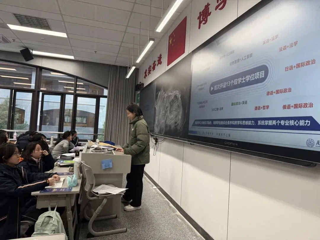 这次的回校宣讲使我感触颇深。重回熟悉的校园,站在讲台上向学弟学妹们分享经验时,看着他们眼中的热忱与向往,仿佛也看到了当年的自己。在交流中,我与学弟学妹们重点分享了在“法语+法学”双学位项目的就读体验,希望能让他们看到小语种专业在未来更多的可能性。在互动环节,我和队员们倾囊相授,耐心答疑,看到他们眼中的憧憬,我们也会心一笑,越发体会到了宣讲的意义。愿我们的点滴分享,能为大家照亮前行之路。期待与他们在厦园相遇!