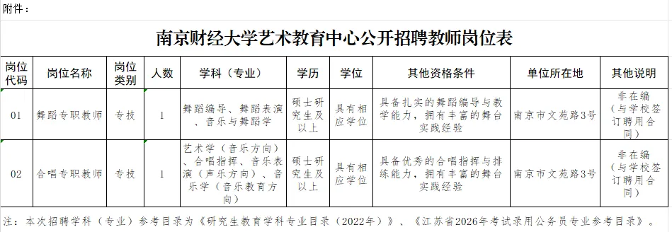 为加强学校人才队伍建设,南京财经大学(学校网址:www.nufe.edu.cn)艺术教育中心现面向社会公开招聘教师(非在编,与学校签订聘用合同)2名,现将有关事项公告如下:附件: