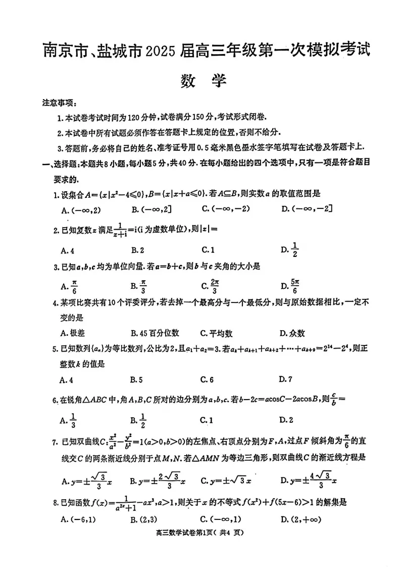 紧急通知!2026届南京盐城一模考试时间推迟!附24&25届高三试题及答案