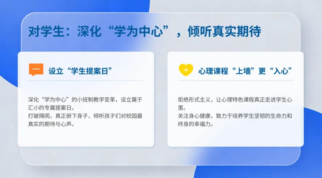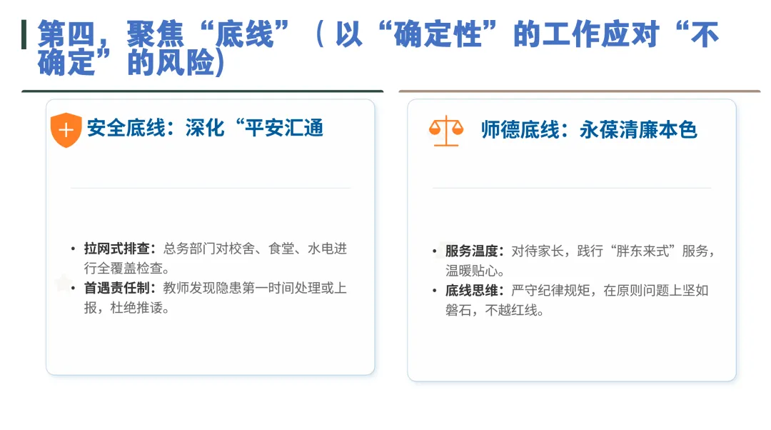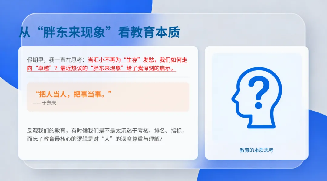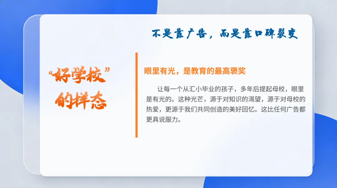 接着,顾校长以“胖东来现象”引发教育思考:“把人当人,把事当事”——教育的核心逻辑,是对人的深度尊重与理解。她描绘了“好学校”的样态:不是靠广告,而是靠口碑裂变;不是搞“表演式教研”,而是真实的学习发生;不是把学生当“管理对象”,而是要有“用户思维”。“让每一个从汇小毕业的孩子,多年后提起母校,眼里是有光的。”这句话深深打动了在场的每一位教师,也为新学期的工作指明了方向。