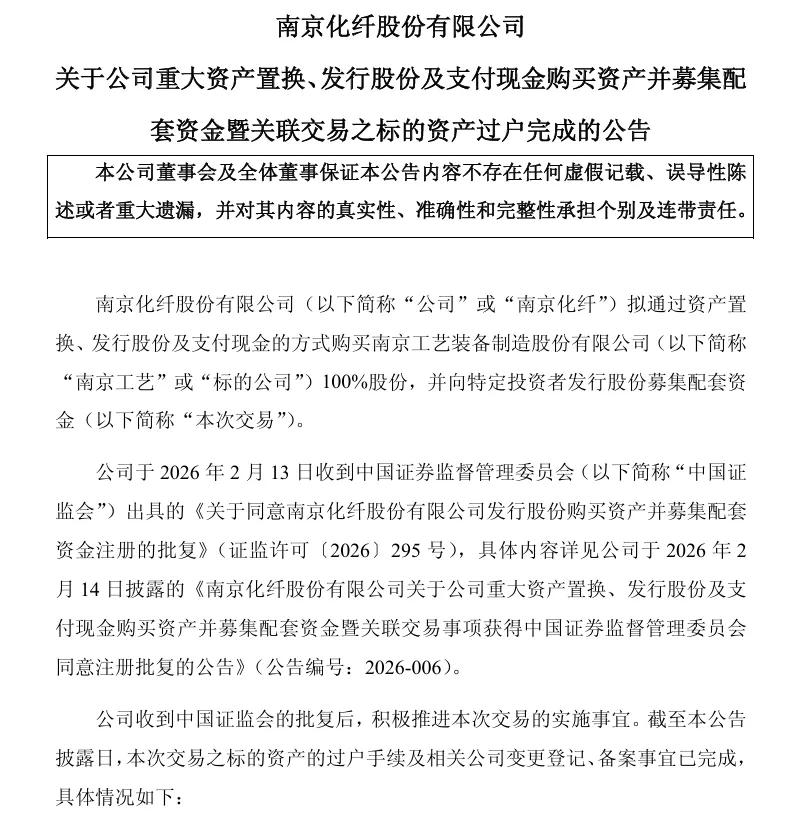 2026年3月3日,南京化纤股份有限公司(以下简称“南京化纤”)发布公告称,公司通过资产置换、发行股份及支付现金的方式购买南京工艺装备制造股份有限公司(以下简称“南京工艺”)100%股份已完成过户,南京工艺正式成为南京化纤的全资子公司。