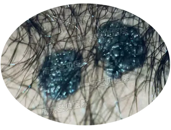 1周后随访,部分疣体脱落,皮损前后径和左右径均稍有减少,皮损出血现象稍有好转。具体情况详见图3。