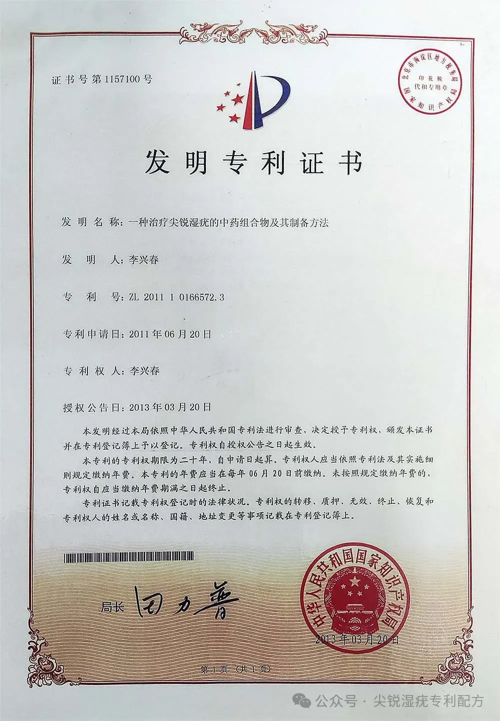 中医认识尖锐湿疣系列讲座:第二讲 阴虚湿热型病毒疣中医认识尖锐湿疣系列讲座:第四讲 血瘀湿热型病毒疣 早在2004年,我国已有针对尖锐湿疣的中医治疗组方,并获得了发明专利。该专利组方在临床应用7年之后,再次优化配伍,使得其治疗的效果更进一步,并于2011年再次获得发明专利,解决了巨大型、顽固性、腔道型等多种疑难尖锐湿疣患者的复发问题。并且,该中医组方采用的方式更加温和,仅以中药汤剂的“口服+泡洗”进行给药,无论是初发还是复发患者,都十分青睐,接受度非常高。更重要的是,该方法是目前敢于给广大患者承诺的治疗方案,接诊后确保去根不复发。