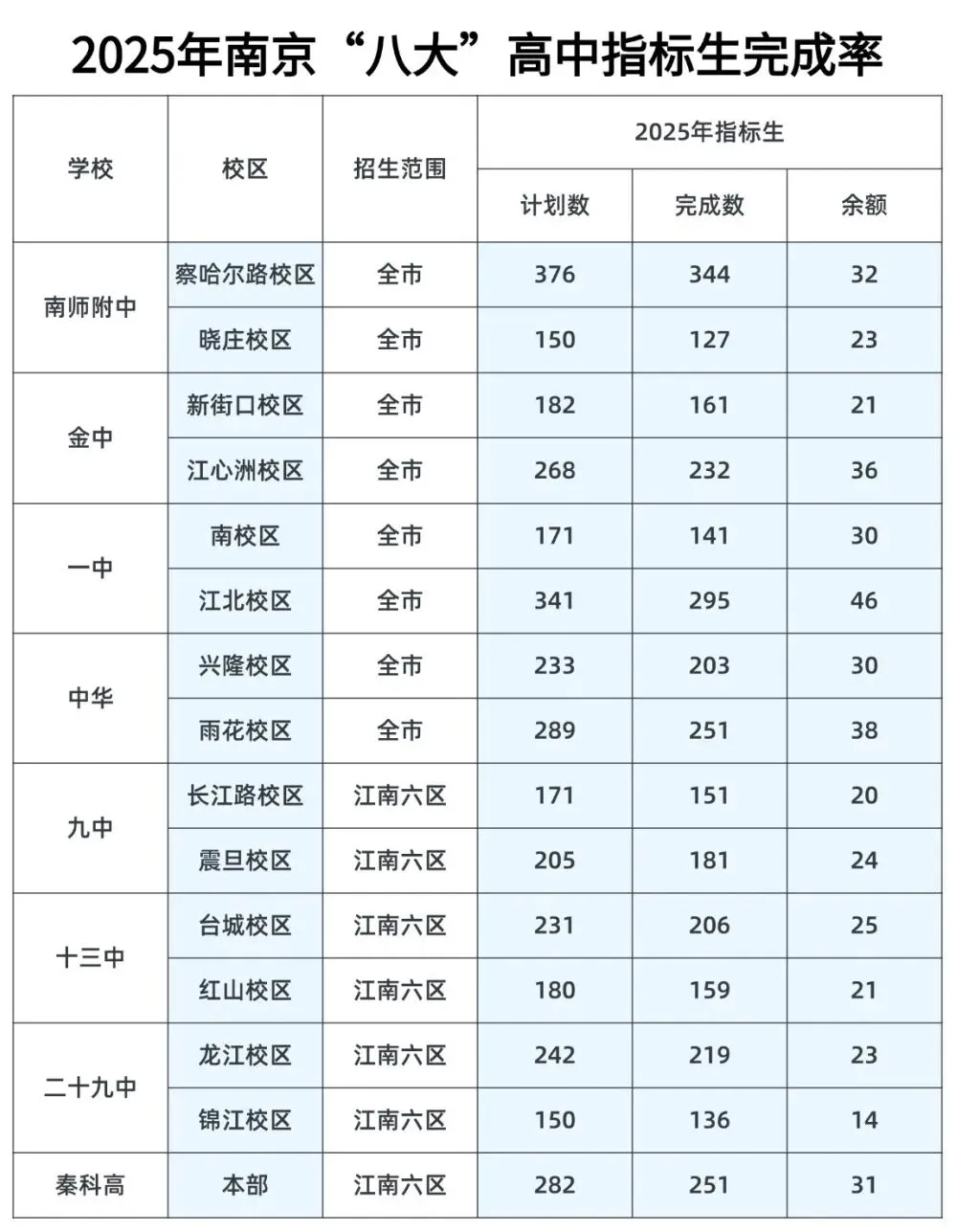 四大市属高中(如南师附中、金中等)按各区初中学生数量比例分配,约1%左右。