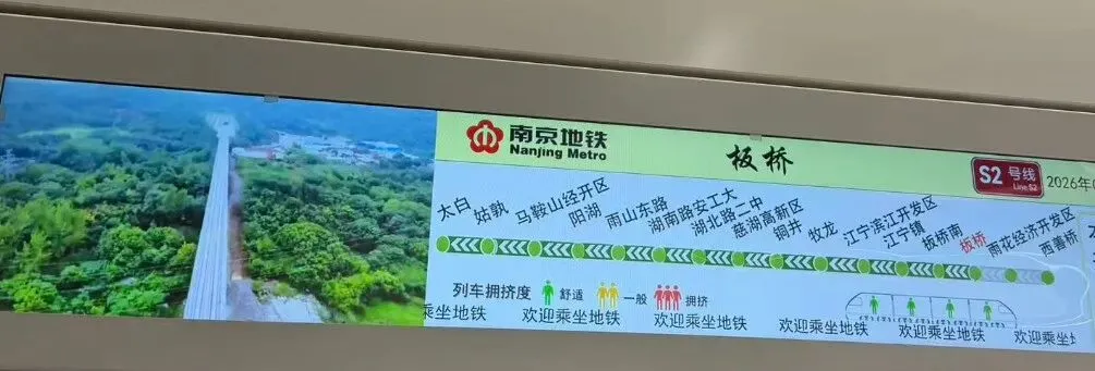 宁马城际S2号线板桥站线路屏首次亮相:从西善桥到太白站的完整站点清晰呈现,列车拥挤度提示、实时到站信息一应俱全