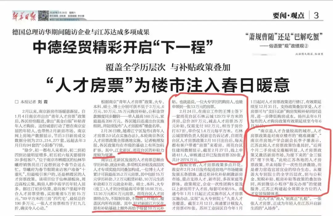 南京市房地产学会副会长、南京楼市主编李子墨在2月28日接受新华日报采访时也表示:“南京是人才含量较高的城市,人才房票政策是对南京楼市的精准滴灌。”“江苏此轮人才房票政策恰逢其时,近两个月二手房成交涨幅明显,人才房票政策又激活新房市场,为接下来的'金三银四'埋下伏笔。此轮江苏各地的人才房票政策,并未局限于一次性经济激励,而是着力营造宜居宜业的综合生态。”政策一落地,不仅让大批青年人才实现安居梦,更是以雷霆之势引爆市场,大批买房人涌进售楼处,成交喜报疯狂刷屏,直接点燃金三银四小阳春。
