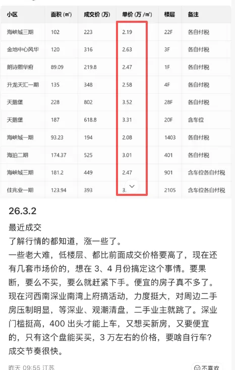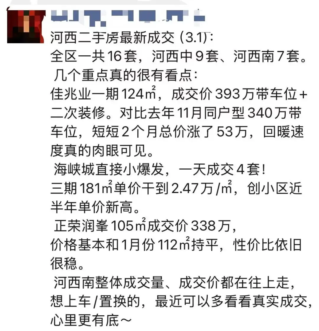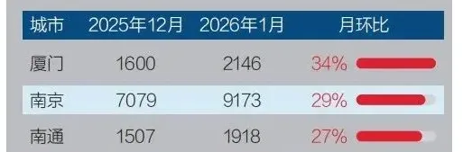 二是成交量,贝壳数据显示,1月南京二手房成交量环比上个月增长30.7%。数据显示,不管是成交价还是成交量,南京都领涨全国。说完数据,我们再来看真实成交案例,据中介消息,近日河西一共成交10多套二手房,其中河西中9套、河西南7套。最有看点的是河西南佳兆业城市广场,一期成交了套124㎡房源,成交价393万,据说这个价是包含车位和二次装修,但对比2025年11月同户型340万带车位的成交价,短短2个月房价回涨了53万,中介直言回暖速度真的肉眼可见。中介还表示:海峡城直接小爆发,一天成交4套。海峡城云玺湾三期181㎡单价2.47 万/㎡成交,创小区近半年单价新高。正荣润峯105㎡成交价338万,价格基本和1月份112㎡成交价持平,性价比依旧很稳。还有中介直言:河西南整体成交量、成交价都在往上走。一些老大难、低楼层都相比此前成交价要高了,便宜的房子真不多了。实际上,就在春节前,南京部分二手房就开始有止跌回升趋势,2月份更是回暖不少。江北新区此前是南京深度超跌区域,最近二手房价增幅明显:南京楼市主编李子墨预测:三月份全国两会政府工作报告对于房地产的表述,至关重要。预计三四月份,最迟五一,国家或针对房地产,出台较大力度的刺激性政策。