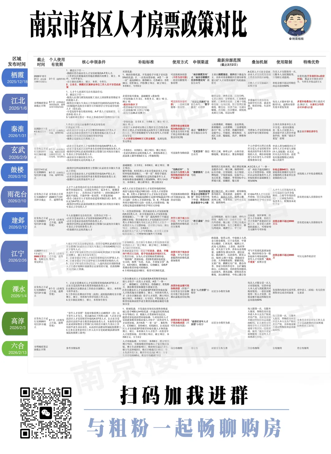 想了解各区政策详情或者有疑问,欢迎扫码进群咨询👏🏻,南京买房就找刚需粗粗。