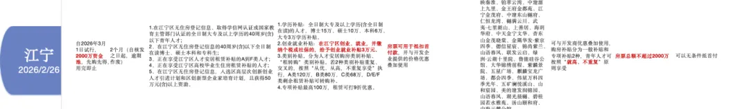 首先,重点讲下我认为是政策有效发布的四个区:江北、江宁、雨花、栖霞,其他区要么是限额太抠搜,要么是限制门槛太狠,要么是洋洋洒洒一张大长图,但表达的信息也不比南京市的那张基础政策长图多什么信息。