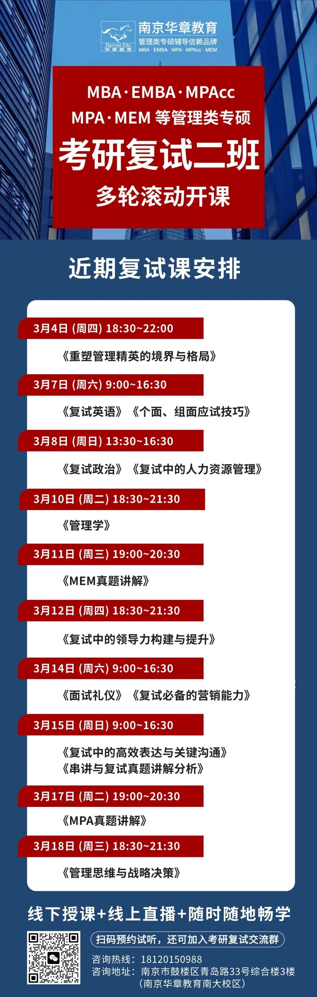 参照往年,复试时间预计在3月下旬,请密切关注公众号及MBA教育中心官网“招生信息”栏的复试通知。