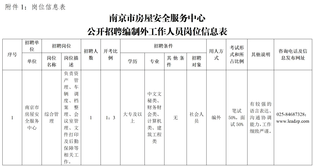 本次招聘公告在江苏领航服务外包有限公司(以下简称“江苏领航”)领航招聘网(http://www.leadzp.com/)和领航优职微信公众号(微信号:Leadzp)发布,招聘岗位具体信息详见附件《南京市房屋安全服务中心2026年公开招聘编制外工作人员岗位信息表》
