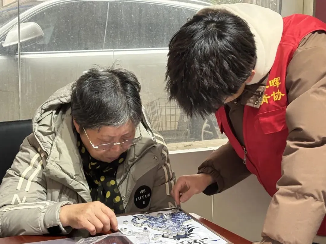 讲解结束后,志愿者有序发放活动材料,逐一示范瓷片拣选、布局构思、拼合粘贴的完整步骤,耐心解答细节疑问。长者们凝神专注,小心翼翼地摆弄着青花瓷片,尽管动作稍缓,但热情不减,在互帮互助中慢慢掌握技巧,将零散的瓷片一点点拼合成兼具青花韵味与马年灵气的作品。